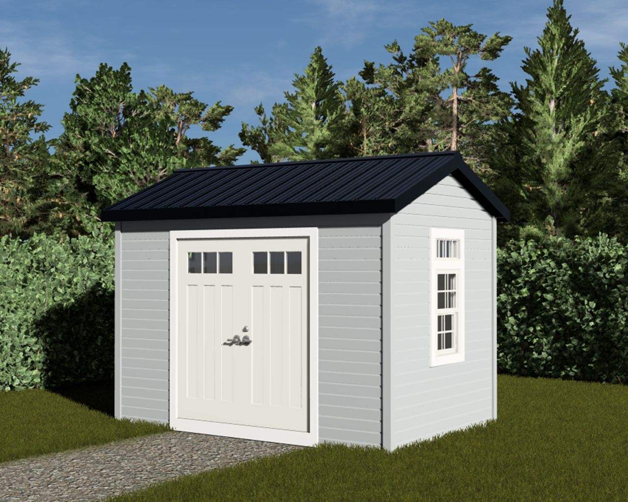 This Craftsman style 12' wide by 8' deep shed offers 96 sqft of versatile space with exceptional curb appeal. It features full-height 6'8" double doors for easy access and two windows that provide natural light, all enhanced by signature Craftsman detailing. Choose between low-maintenance vinyl siding or upgraded board-and-batten designer metal siding to match your style and durability preferences.