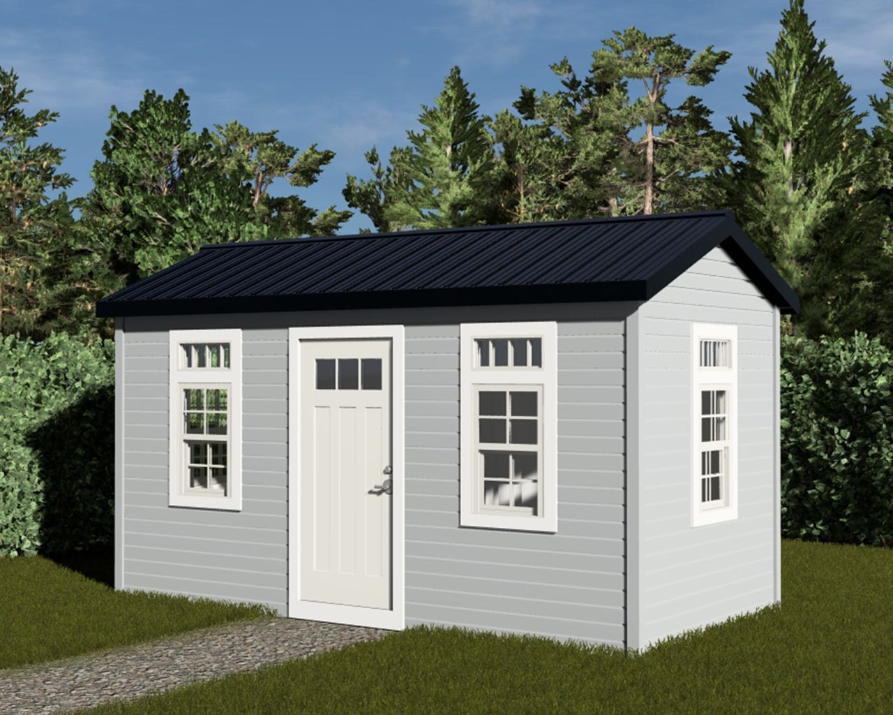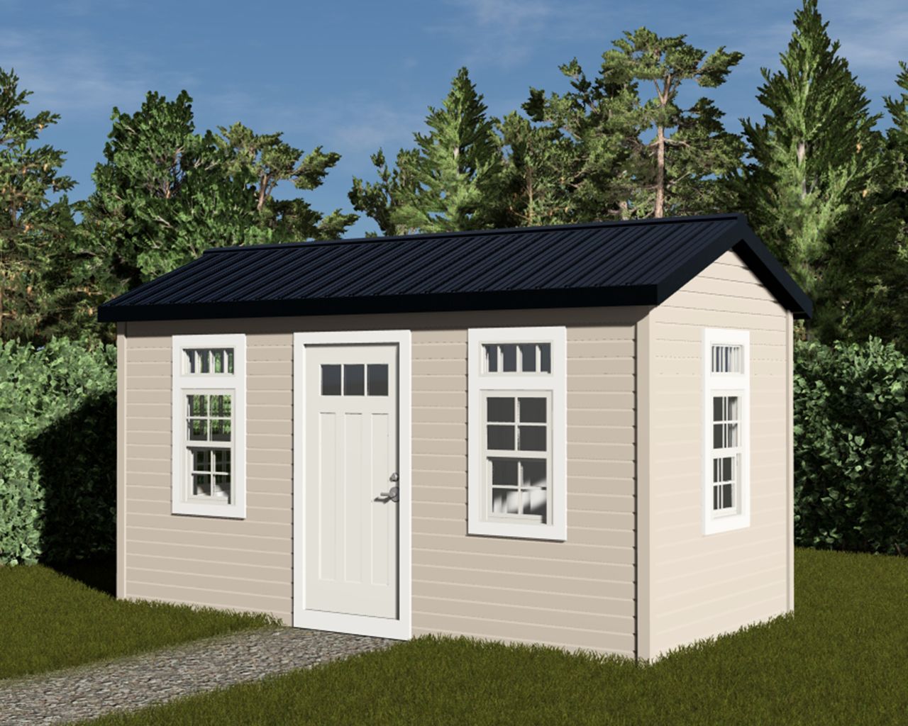 This Craftsman style 16' wide by 8' deep shed provides 128 sqft of versatile, well-lit storage space. It features a full-height 6'8" single door and four windows that flood the interior with natural light, enhanced by signature Craftsman detailing. Choose between low-maintenance vinyl siding or upgraded board-and-batten designer metal siding to perfectly match your style and durability preferences.