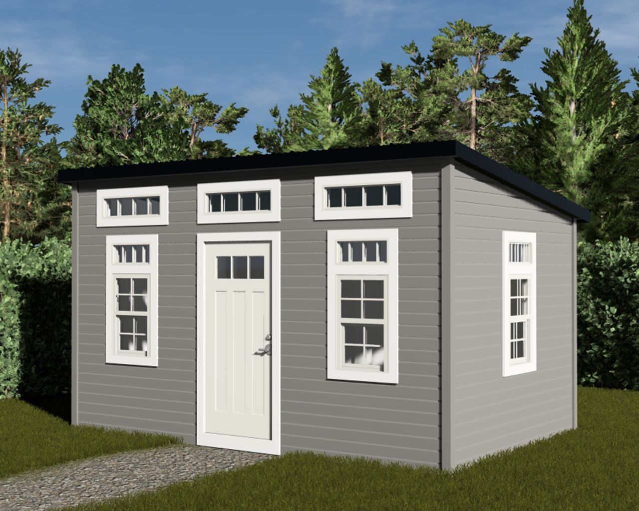 This modern 16' x 10' shed offers 160 sqft of bright, functional space. It features a full-height 6'8" single door, four large windows, and three separate transoms above, flooding the interior with natural light. Choose between low-maintenance vinyl siding or upgraded board-and-batten metal siding to perfectly match your style and durability needs. Combining sleek minimalist design with practical functionality, this shed is ideal for contemporary outdoor storage.