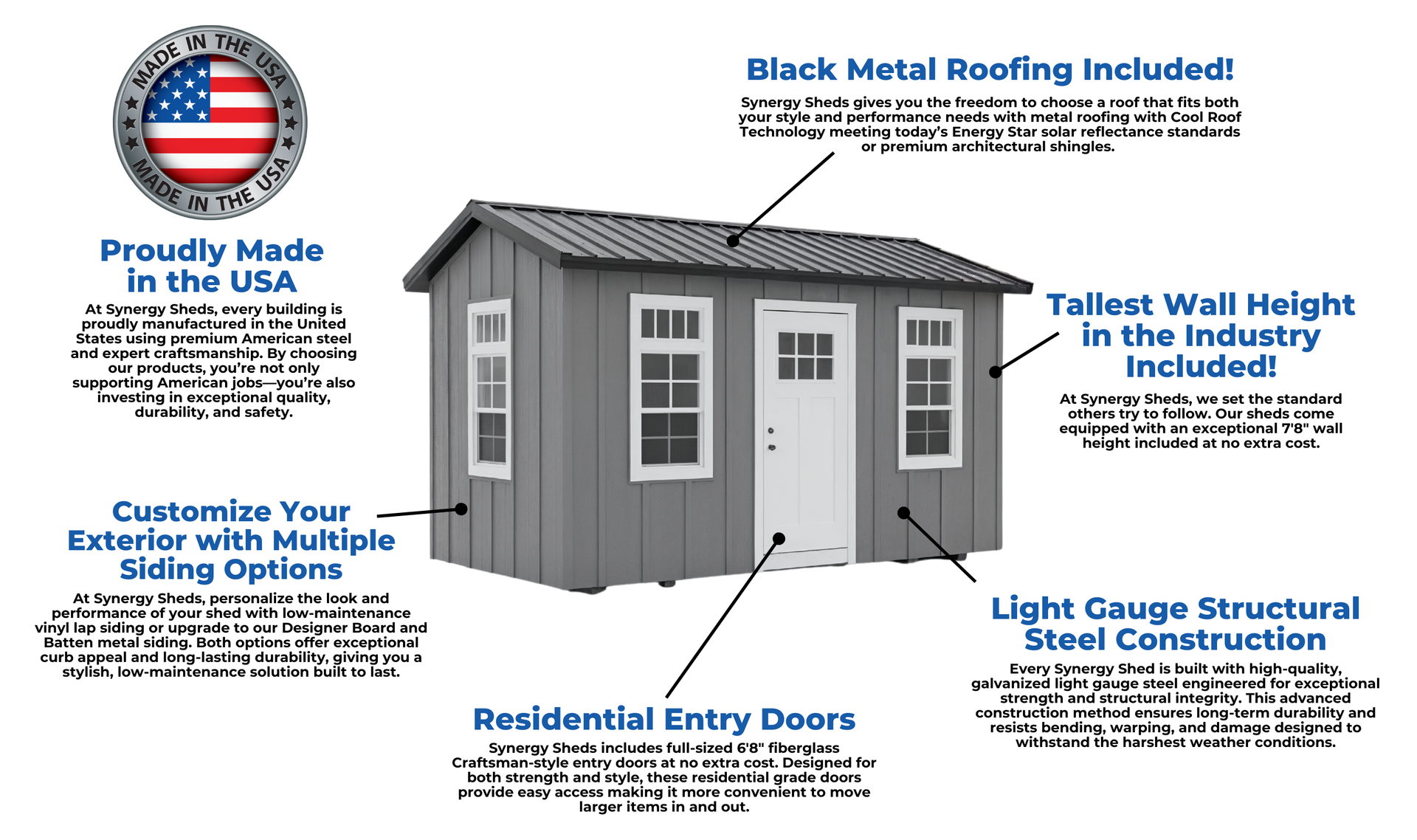 Built with galvanized steel frames, pressure-treated skids, and weather-resistant siding and roofing, Synergy sheds and garages are engineered to withstand heavy use and extreme climates for decades.